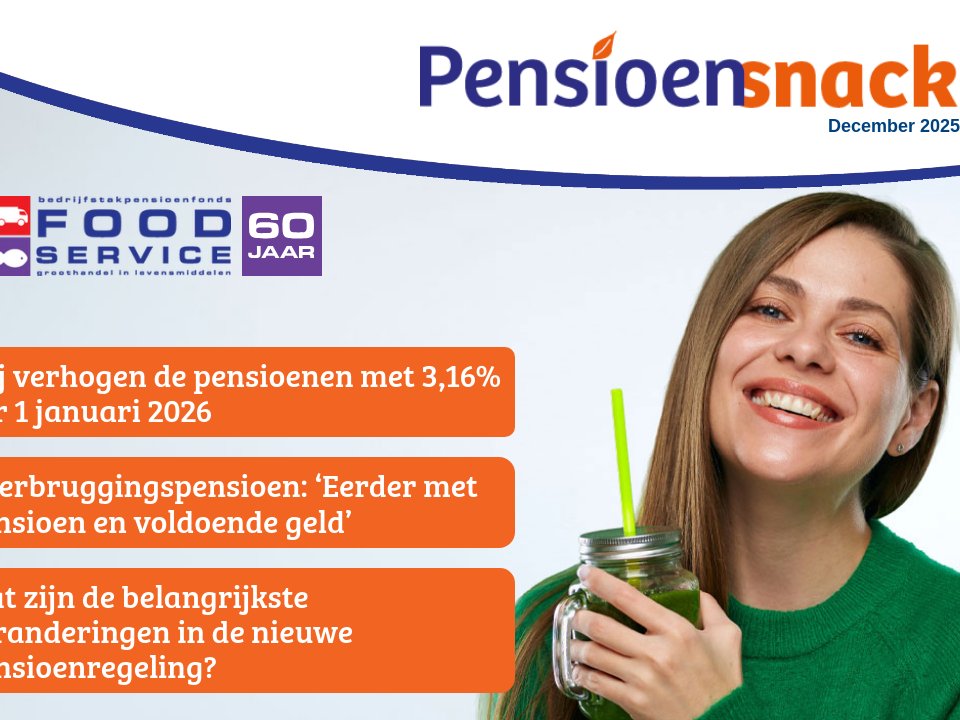 In deze editie: Wij verhogen de pensioenen met 3,16% per 1 januari 2026 Overbruggingspensioen: ‘Eerder met pensioen en voldoende geld’ Wat zijn de belangrijkste veranderingen in de nieuwe pensioenregeling? Wij verhogen de pensioenen met 3,16% per 1 januari 2026 Overbruggingspensioen: ‘Eerder met pensioen en voldoende geld’ Wat zijn de belangrijkste veranderingen in de nieuwe pensioenregeling? December 2025 December 2025